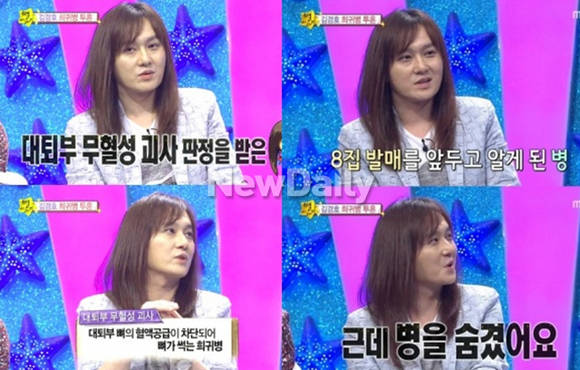 가수 김경호가 희귀병 투병 사실을 숨긴 이유를 고백했다.지난 24일 오후 방송된 MBC '별바라기'에는 가수 김경호, 동방신기 유노윤호, 비스트 윤두준 양요섭 손동운이 출연해 재치 있는 입담을 뽐냈다.이날 김경호 팬은 "오빠가 2007년 왕성하게 활동하다 돌연 방송 활동을 중단했다"고 밝혔고, 이에 김경호는 "대퇴부 무혈성 괴사를 앓았다. 혈액 공급이 차단돼서 뼈가 썩는 병"이라고 말했다.김경호는 "8집 발매를 앞두고 이 병을 알게 됐다. 그런데 병을 숨겼다. 병의 존재가 알려지면 아무도 불러주지 않아서 가수를 그만둬야 하는 상황이 올 것 같아 두려웠닸. 너무 많이 병세가 진행돼 결국 무대에서 8집 활동을 하지 못하게 됐다"고 털어놨다.이어 김경호는 "그런 희귀한 병이 있는 지도 몰랐다. 의사에게 죽는다는 말을 들었고, 인대 21줄 연결수술을 받았다. 한 시간 동안 공연을 해야 하는데 많은 관객들 앞에 서니 초인적인 힘이 나더라"고 말했다.김경호 투병 고백을 접한 네티즌들은 "김경호 투병 사실 숨긴 이유 짠하네", "김경호에게 그런 사연이 있는 줄 몰랐다", "김경호 투병 고백 안타깝더라", "몸 관리 잘 하세요!", "김경호 투병 이젠 건강에 이상이 없는 건가?" 등의 반응을 보였다.[김경호 투병, 사진=MBC '별바라기' 방송 캡처]