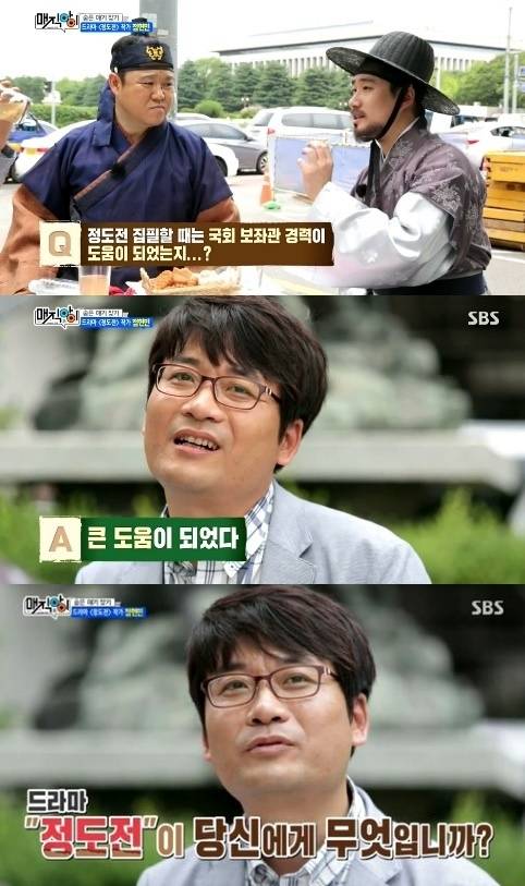 '정도전' 정현민 작가가 드라마에 대한 비하인드 스토리를 공개했다.'정도전' 정현민 작가는 지난 29일 방송된 SBS '매직아이' 2부 코너 '숨은 얘기 찾기'에 출연했다. '숨은 얘기 찾기'는 김구라와 배성재가 핫한 이슈의 이면을 찾아가 뒷이야기를 들어보는 코너.정도전'은 명대사로 수많은 어록을 남기고, 리더십에 대한 화두를 던지는 등 기존의 사극과는 다른 신개념 사극으로 인정을 받았던 작품이다.이날 '정도전' 정현민 작가는 대중의 정치 리더십 욕구가 반영된 작품을 쓴 데에는 "10년 동안 국회의원 보좌관이었던 이력이 큰 도움이 됐다"고 밝혔다.또한, "드라마 '정도전'을 보면 일반 사극과는 달리 절대 악도 절대 선도 없다. 그걸 의도했다기 보다 내가 경험했던 정치는 선악의 싸움이 아니다. 다들 그럴듯한 논리로 싸웠다"며 "그런 경험을 10년간 하면서 '정도전'에 반영된 것 같다"고 전했다.[정도전 정현민 작가, 사진=SBS '매직아이' 방송 캡처]