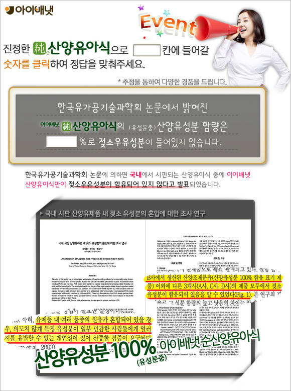 산양분유 전문기업 아이배냇㈜(대표이사 전석락)의 '純(순)산양유아식'이 최근 국내 유일 산양분유 중 젖소우유 성분이 일체 들어있지 않음이 검증됐다.한국유가공기술과학회에 수록된 '국내 시판 산양유제품 내 젖소 유성분의 혼입에 대한 조사 연구' 논문에 의하면 아이배냇 純(순)산양유아식은 국내에 유통되고4개회사 산양분유 제품 중 유일하게 젖소우유성분이 함유되어 있지 않은 것으로 나타났다.삼육대학교 동물자원학과 한경식 교수팀이 발표한 본 논문에는 유제품 내 여러 품종의 원유가 혼합되어 있을 경우 의도치 않게 특정 유성분이 일부 민감한 사람들에게 알러지를 유발할 수 있는 개연성이 있어 신중한 검증이 요구된다면서 아이배냇에서 생산된 순산양분유(산양유성분 100%함유 표기 제품) 이외에 다른 3개사의 모든 제품에서 젖소 우유성분이 함유되어 있음을 알 수 있었다는 내용이 포함됐다.한 교수는 또한 논문에 대해 산양 유성분에 대한 논란이 있어 산양분유와 산양우유 제품간 (젖소성분) 혼입도를 조사해 고객 분들에게 정확한 제품 구매의 판단 기준을 제공해 주자는 취지에서 조사했다"면서 "산양분유 제품에 유성분 함량 기준이 식품성분 규격이 명시되어 있지 않은 국내 현실에서 혼입 여부 정보를 제공하는 것만으로도 제품 선택에 유용한 근거가 될 수 있을 것"이라고 설명하기도 했다.아이배냇 전석락 대표는 "이번 기회를 통해 아이배냇 순 산양유아식이 진정한 아기먹거리 순수주의로 입증된 좋은 기회라며, 앞으로 더욱더 제품 개발에 있어서 99%가 좋고 1%라도 나쁘면 절대 허락하지 않겠다는 창조경영의 철학 이미지을 다시 한번 다지 겠다'고 말했다.이에 따라 아이배냇은 내달 17일까지 아이배냇 순산양유아식의 산양유성분 함량을 맞추는 퀴즈이벤트를 진행한다. 총 54명을 선발하여 백화점상품권 30만원권 등 다양하고 푸짐한 상품이 제공될 예정이다.
