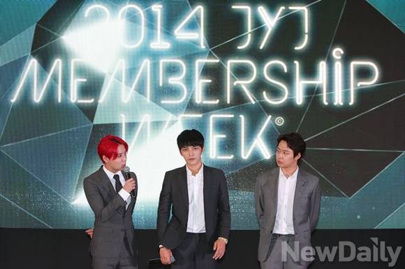 세 번째 JYJ 멤버쉽 위크가 공개됐다. '2014 JYJ 멤버쉽 위크(MEMBERSHIP WEEK)'가 서울 삼성동 코엑스에서 열렸다. 이날 행사는 JYJ 멤버 김재중, 박유천, 김준수가 참석해 소감을 밝혔다. 지난 2012년을 시작으로 올해로 3번째를 맞이하는 'JYJ 멤버십 위크'는 새로운 기획으로 팬들과 만날 예정이다. 이번 행사를 통해 한류 문화 콘텐츠의 우수성을 알리고 대중문화 발전에 기여 할 것으로 기대된다. JYJ는 오는 8월 9일 잠실주경기장에서 2014 아시아 투어 'THE RETURN OF THE KING' 공연을 통해 팬들과 만날 예정이다.