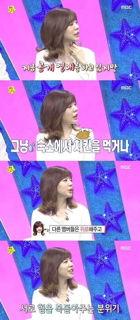 '별바라기' 써니가 멤버들의 공개연애 후 근황에 대해 밝혔다.지난달 31일 방송된 MBC '별바라기'에는 걸그룹 소녀시대 써니, 헨리, 배우 안재모와 임호가 출연해 솔직한 입담을 뽐냈다.소녀시대는 윤아는 이승기와, 수영은 정경호, 티파니는 2PM 닉쿤, 태연은 엑소 백현과 공개 연애 중이다. 이에 써니는 "열애가 공개가 된 후 더 조심스러워져 데이트도 잘 못하고 있다. 그냥 숙소에서 멤버들과 치킨을 시켜 먹는다"고 근황을 전했다.이어 써니는 강호동이 "스캔들 나기 전 멤버들이 열애를 몰랐던 적도 있냐?"고 묻자 "소녀시대 멤버들끼리는 자주 얘기를 해서 미리 알고 있었다"고 밝혔다.또한, 써니는 소녀시대 분위기에 대해 "사실 해당 멤버가 많이 미안해하는 분위기다. 그러다보니까 다른 멤버들은 주로 위로해주고 토닥토닥을 많이 해준다"고 말했다.[별바라기 써니, 사진=MBC '별바라기' 방송 캡처]