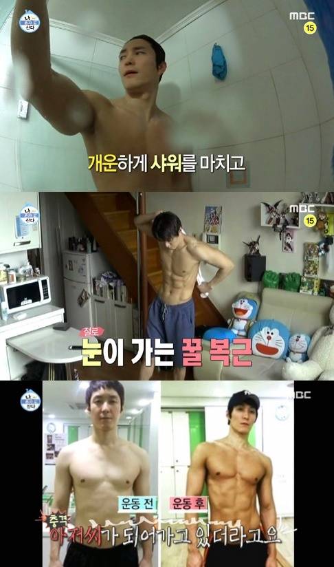 배우 심형탁이 탄탄한 복근을 공개했다.지난 1일 방송된 MBC '나 혼자 산다-The 무지개 라이브'에서는 동안 SNS를 통해 장난감에 대한 사랑을 숨기지 않으며 연예계 대표 오타쿠로 인정받은 배우 심형탁의 반전 일상을 그려졌다.이날 심형탁은 도라에몽으로 도배된 침실에서 눈을 뜨자마자 도라에몽, 아이언맨 등 피규어에 쌓인 먼지를 털어내고 샤워를 했다.특히, 과감하게 상의를 탈의한 심형탁은 완벽한 꿀 복근을 자랑했다. 이에 김광규는 "회장님도 저런 몸매였는데.."라며 노홍철을 언급했다. 그러자 노홍철은 "한때요"라며 씁쓸한 표정을 지어 웃음을 자아냈다.심형탁은 "드라마 촬영하면 긴장하고 스트레스 받는다. 고된 날이면 항상 소주 한 병을 마시고 잠이 들다 보니 어느새 아저씨가 되어가고 있더라. 그걸 계기로 운동을 시작했다"며 "이젠 드라마를 찍고 아무리 힘들어도 1시간 이상 운동을 한다"고 밝혔다.['나혼자산다' 심형탁 복근 공개, 사진=MBC '나 혼자 산다' 방송 캡처]