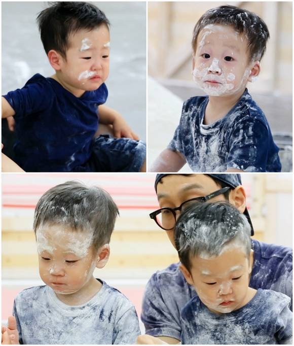 '슈퍼맨이 돌아왔다'의 국민 쌍둥이 이서언 이서준이 백곰과 빡구로 변신했다.오는 3일 방송되는 KBS 2TV '해피선데이-슈퍼맨이 돌아왔다'(이하 '슈퍼맨이 돌아왔다') 38회에서는 '엄마를 이기는 법'이 전파를 탄다.이날 이휘재는 쌍둥이의 촉감 발달을 위해 밀가루 체험장에 방문했다. 눈 앞에 수북이 쌓인 밀가루 산을 본 쌍둥이는 상반된 반응으로 아빠를 깜짝 놀라게 했다. 못 말리는 '호기심 대장' 서준이는 의외로 밀가루를 무서워하는 반면, 평소 겁이 많은 서언이가 밀가루 산으로 돌격한 것.얼굴 가득 밀가루 범벅이 된 서언이는 흡사 아기 백곰같았다. 눈 밭에서 걸어다니는 아기 백곰처럼 밀가루 산을 오르내리는 서언이의 모습을 보던 이휘재는 "이서언~ 아주 곰 됐는데? 백곰?"하며 웃음을 감추지 못했다.이번에는 이휘재가 밀가루를 피해다니는 서준이의 관심 끌기에 나섰다. 서준이의 얼굴에 밀가루를 묻혀 '빡구'로 만들어 버린 것. 밀가루로 가짜 콧물을 그린 서준이 표 '깜찍 빡구' 모습에 이휘재는 물론, 주변 모두가 박장대소를 했지만 영문을 알리 없는 서준이는 눈만 껌뻑껌뻑 거렸고, 이에 체험장 안에는 한동안 웃음소리가 끊이질 않았다는 후문이다.한편, 빡구와 백곰으로 변신한 서언-서준 쌍둥이의 모습은 3일 방송되는 KBS2 '슈퍼맨이 돌아왔다' 38회에서 공개된다.['슈퍼맨' 서언 서준 밀가루놀이, 사진= KBS 2TV '해피선데이-슈퍼맨이 돌아왔다']