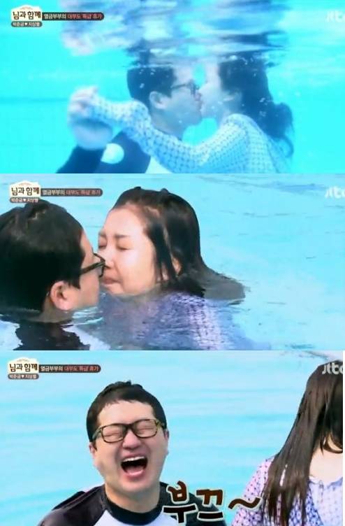 지상렬 박준금이 과감한 수중키스를 선보였다.지난 7월 30일 방송된 JTBC '님과 함께'에서는 대부도로 여름휴가를 떠난 지상렬 박준금 가상 부부의 모습이 그려졌다.박준금이 미리 예약해놓은 펜션에 도착한 '열금부부'는 물놀이를 즐기기 위해 야외에 딸린 수영장을 찾았다. 이에 자칭 '마린보이' 지상렬이 맥주병 아내 박준금을 위한 일일 강사가 돼 수영 특훈에 나섰고, 즐거운 분위기 속에서 배울 수 있도록 재미있는 게임과 내기 등을 동원해 수영을 가르쳤다.특히, 얼굴이 물에 잠기는 것을 무서워하는 박준금이 물에 친숙해질 수 있도록 손을 잡고 연거푸 잠수 연습을 하던 도중 지상렬이 "수중키스 어떠냐"고 제안했다.박준금은 부끄러워하면서도 "우리도 한 번 멋지게 찍자"며 제안을 수락했고, 이어 지상렬 박준금은 세 번의 도전 끝에 대담한 애정행각을 펼쳤다.[지상렬 박준금 수중키스, 사진=JTBC '님과 함께' 방송 캡처]