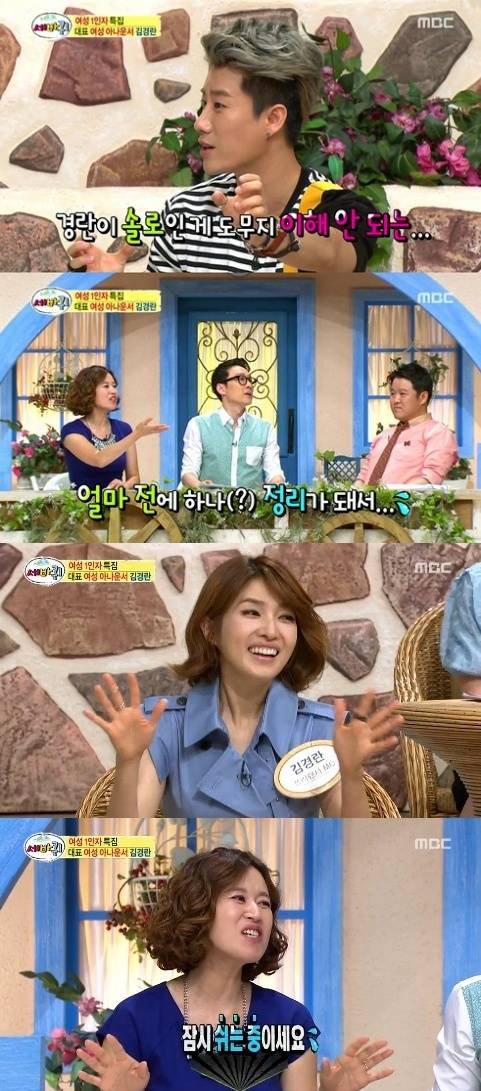 방송인 김경란이 전 남자친구인 배우 송재희의 언급에 당황한 기색을 감추지 못했다.지난 2일 방송된 MBC '세바퀴'에서는 '여성 1인자 특집'으로 방송인 김경란, 변정수, 메이크업 아티스트 정샘물, 외국인 국악교수 힐러리 핀첨 성, 가수 산이와 레이나 등이 출연했다.이날 김경란은 "결혼이 세상에서 제일 어려운 일 같다. 언제쯤 누구와 결혼할 수 있을까 싶다"고 털어놨다.이에 래퍼 산이는 "오늘 김경란을 처음 봤는데 잠깐 말씀하시는 것만 들어도 아름답고 지적이고 인간적이다. 왜 솔로인지 도무지 이해가 안 된다"고 말했다.그러자 MC 박미선은 "김경란이 얼마 전에 하나 정리가 됐다. 지금 쉬는 중"이라고 돌직구를 날렸다. 이는 지난 5월 김경란과 결별한 송재희를 간접적으로 암시한 것.김경란은 갑작스러운 전 연인 송재희의 언급에 고개를 절래절래 흔들며 크게 당황해 웃음을 자아냈다.[김경란 전 연인 송재희 언급, 사진=MBC '세바퀴' 방송 캡처]