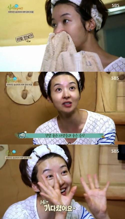 배우 송선미가 민낯을 공개했다.3일 오전 방송된 SBS '잘 먹고 잘 사는 법-식사하셨어요?'에서는 MC 이영자 임지호와 함께 경상남도 하동으로 1박2일 여행을 떠난 송선미의 모습이 그려졌다.이날 이영자는 숙소에 도착 후 송선미와 차 한 잔을 하기 위해 송선미의 방을 급습했다. 세면을 마친 송선미는 카메라를 전혀 신경쓰지 않고 화장품을 바르며 리얼한 민낯을 보여줬다.송선미는 예상치 못한 이영자의 방문에 전혀 당황하지 않고 잡티 없는 깨끗한 피부와 굴욕 없는 미모로 아름다운 민낯을 뽐냈다.송선민의 민낯을 본 MC 이영자는 "피부가 어쩜 그렇게 좋으냐. 다크써클도 없다"며 감탄했다. 이에 송선미는 꿀피부 비결로 꾸준한 필라테스와 규칙적인 식습관을 꼽았다.'식사하셨어요' 송선미 민낯을 본 네티즌들은 "식사하셨어요 송선미 민낯도 예쁘네", "송선미 피부에서 빛이 난다", "식사하셨어요 송선미 민낯 굴욕이 뭐예요?", "송선미 광채피부 부러워", "식사하셨어요 송선미 민낯 여신이 따로 없네" 등의 반응을 보였다.[식사하셨어요 송선미 민낯, 사진=SBS '식사하셨어요' 방송 캡처]