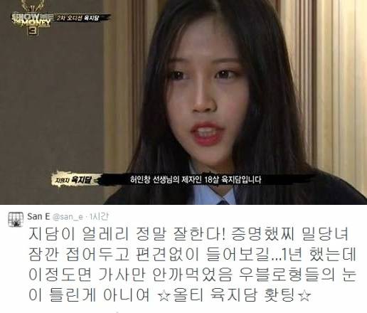 래퍼 산이가 '쇼미더머니3' 육지담의 '얼레리'를 극찬했다.산이는 6일 자신의 트위터에 "지담이 '얼레리' 정말 잘한다! 증명했지. '밀당녀' 잠깐 접어두고 편견없이 들어보길. 1년 했는데 이 정도면 가사만 안까먹었음. '우블로'형들의 눈이 틀린게 아니여. 올티 육지담 파이팅"이라는 글을 남겼다.Mnet '쇼미더머니3' 측은 참가자 올티와 육지담의 스페셜 음원 '쇼미더머니3 올티 vs 육지담'을 6일 정오 엠넷닷컴을 포함한 각종 음원사이트를 통해 공개했다.'쇼미더머니3 올티vs육지담'은 오는 7일 방송되는 '쇼미더머니3' 6화에서 공개되는 1차 본공연 무대를 위해 타블로-마스타우 팀의 래퍼 지원자 올티와 육지담이 동일한 비트로 작업한 랩을 담은 곡이다.육지담은 "여고생 래퍼라고 만만하게 보지 않도록 최선을 다해 이번 랩을 준비했다. 지난 방송과는 확연히 달라진 모습을 음원을 통해 확인해달라"고 각오를 밝혔다.한편, 본공연에 진출하게 된 래퍼 지원자들의 무대는 7일 오후 11시 방송되는 Mnet '쇼미더머니3'에서 공개된다.[산이 육지담 얼레리 응원, 사진=Mnet '쇼미더머니3'/산이 트위터 캡처]