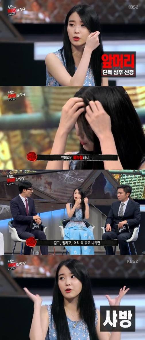 가수 아이유가 특유의 솔직 화법으로 여자들만의 비밀을 고백했다.지난 8일 첫 방송된 KBS 2TV 새 예능프로그램 '나는 남자다'에서는 상대적으로 여자들이 많이 활동하는 직업군에서 생활하는 다양한 남성들이 출여해 '청일점'을 주제로 토크를 나눴다.이날 "남자 분들이 진짜 모르던데 여자들이 급하게 밖에 나갈 때 앞머리만 감고 나갈 때가 있다"고 밝혀 놀라움을 자아냈다.이어 아이유는 "앞머리만 감고, 말리고, 머리 딱 묶고 나가면 머리를 감은 것 같은 느낌이 난다"고 설명했다.이에 MC 유재석은 "이거는 진짜 몰랐다"고 말했고, 장동민은 "그거는 여자들이 잘 모르는 건데.. 앞머리가 자기 코에만 있으니까 냄새가 안 난다고 생각하는 거다"고 밝혀 웃음을 자아냈다.['나는 남자다' 아이유, 사진=KBS '나는 남자다' 방송 캡처]