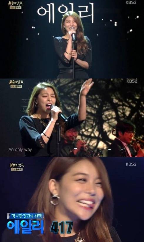 가수 에일리가 '불후의 명곡' 윤복희 편에서 최종 우승을 차지했다.9일 방송된 KBS 2TV '불후의 명곡-전설을 노래하다' 윤복희 편에는 조성모, 김소현&손준호, V.O.S&소리얼, 옴므, 에일리, 손승연, 멜로디데이가 출연해 선의의 경쟁을 펼쳤다.이날 에일리는 '여러분'을 방송 최초, 원곡 버전으로 열창했다. 에일리는 풍부한 감성과 폭풍 가창력을 보여줬으며, 무대 마지막엔 어린이 합창단과 함께 웅장한 무대를 꾸며 감동을 배가시켰다.에일리 '여러분' 무대를 본 윤복희는 엄지 손가락을 들어보이며 감탄했고, 무대가 끝나자 관객들은 기립박수를 보냈다.윤복희는 "에일리가 부른 '여러분'이 지금까지 리메이크한 가수들 중 최고인 것 같다"면서 "심장이 벌렁거려 앰뷸런스에 실려갈 것 같다"고 극찬을 아끼지 않았다.결국 에일리 '여러분'은 417점을 획득하며 '불후의 명곡' 우승 트로피를 거머쥐었다.[에일리 '여러분', 사진=KBS2 '불후의 명곡' 방송 캡처]