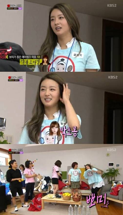 걸그룹 에이핑크 윤보미가 팀 내 미모 1순위로 오하영을 꼽았다.지난 9일 방송된 KBS 2TV '인간의 조건'에서는 '피부&탈모 정복하기' 미션을 체험하는 여성 멤버들의 모습이 그려졌다.이날 새 멤버로 합류한 에이핑크 윤보미는 "멤버들 중 실제로 누가 제일 예쁘냐"는 질문에 "오하영"이라고 답했다.이어 윤보미는 2위로 박초롱을 꼽았고, 김신영이 "그 다음엔?"이라고 묻자 "뽀미~"라고 외치며 귀여운 표정과 포즈를 취해 야유를 받았다.에이핑크 미모 1위 오하영에 네티즌들은 "에이핑크 미모 1위 오하영 예전에 손나은도 그러더니..", "인간의 조건 윤보미 귀여워", "에이핑크 미모 1위 오하영 기분 좋겠다", "인간의 조건 윤보미 예능감 살아있네~", "에이핑크 미모 1위 오하영 인정!" 등의 반응을 보였다.[에이핑크 미모 1위 오하영, 사진=KBS2 '인간의 조건' 방송 캡처]