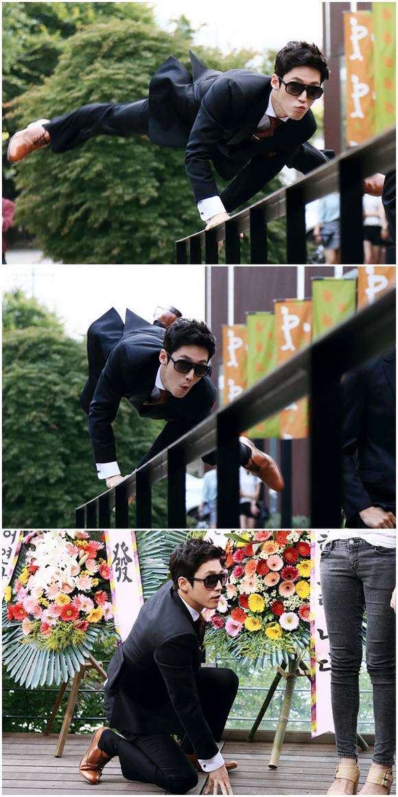 사진 속 장혁은 말끔한 수트와 날렵하게 뻗은 다리 라인, 게다가 화보의 한 장면처럼 완벽한 착지자세까지 선보이며 차원이 다른 '월담의 품격'을 선보이고 있다. 동시에 입술을 쭉 내민 채, 코믹 표정까지 놓치지 않는 센스 넘치는 장혁의 모습이 깨알웃음을 자아낸다.
