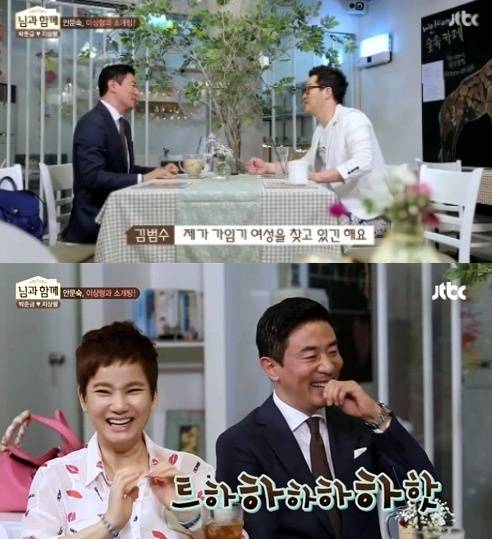 김범수가 안문숙에게 호감을 드러냈다.지난 13일 방송된 JTBC 재혼 미리보기 '님과 함께'에서는 지상렬과 박준금이 외로운 친구 안문숙에게 전 아나운서 김범수를 소개하는 모습이 그려졌다.이날 안문숙은 김범수가 나타나기 전부터 자신의 건강한 자궁에 대해 어필했다. 이 말을 들은 지상렬은 김범수가 자리에 앉은 후 "문숙이 누님처럼 자궁 건강한 여자 어떠냐"고 질문했다.다소 황당한 질문에도 김범수는 "나도 가임기 여성을 찾고 있긴 하다. 외롭다"고 수줍게 말해 분위기를 화기애애하게 만들었다.[안문숙 김범수 소개팅, 사진=JTBC '님과 함께' 방송 캡처]