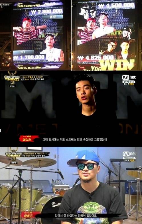 '쇼미더머니3' 아이언이 비아이를 누르고 1위를 차지했다.14일 방송된 Mnet '쇼미더머니3' 7화에서는 도끼-더 콰이엇 팀 대 스윙스-산이 팀의 대결과 앞서 진행된 양동근(YDG) 팀 대 타블로 마스타 우(YG) 팀의 결과가 공개됐다.래퍼 지원자 8인은 남녀 각 100명씩 총 200명의 관객 평가단의 투표에 따라 공연 지원금을 받는다. 네 팀의 대결 결과, 패배한 팀에서 더 적은 공연지원금을 획득한 래퍼 지원자 1명씩 탈락하게 된다.이날 아이언은 모두의 예상을 깨고 가장 많은 공연비를 획득하며 1위를 차지했다. 이에 양팀의 총합계 금액에서 YDG 팀은 482만5000원, YG 팀은 450만원의 수익을 올리며 타블로 마스터 팀이 패했다.특히, 170만원의 공연비를 획득한 비아이(B.I)는 280만원을 기록한 올티에 밀리며 탈락하고 말았다. 비아이의 탈락에 멘토들과 출연진들은 놀라움을 금치 못했고, 마스타 우는 "비아이 무대가 제일 좋았다"며 아쉬움을 드러냈다.앞서 양동근의 방관으로 팀 선택을 후회한다고 밝혔던 아이언은 무대 뒤에서 눈물을 훔치며 안도의 숨을 내쉬었다.양동근은 제작진과의 인터뷰에서 "아이언이 효자다"라며 "남자라면 강하게 키워야 한다. 워낙 인정을 받은 친구니까 알아서 잘 하겠다라는 믿음이 있었다"고 밝혔다.['쇼미더머니3' 아이언 1위, 사진=Mnet '쇼미더머니3' 방송 캡처]