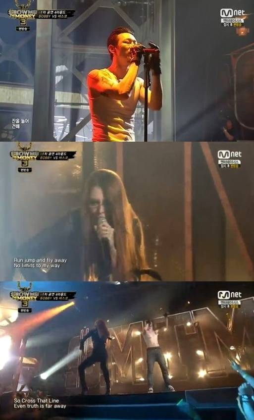 뮤지컬 배우 차지연이 강렬한 카리스마를 뽐내며 바스코와 환상적인 무대를 선보였다.지난 14일 방송된 Mnet '쇼미더머니3'에서는 지난 '단독 공연 미션'에서 각 팀 내 1위를 한 도끼-더 콰이엇 팀의 바비와 스윙스-산이 팀의 바스코가 1차 공연 대결을 펼쳤다.이날 바스코는 록사운드가 강렬한 '플레스&블러드(Flesh&Blood)'와 '게릴라스 웨이(Guerrilla's Way)' 무대를 꾸몄다. 바스코는 점점 분위기가 달아오르자 상의를 탈의하며 열정을 폭발시켰다.이어 절정의 순간 차지연이 깜짝 등장해 관객들을 흥분의 도가니로 만들었다. 몸매가 그대로 드러는 밀착된 블랙 의상을 입은 차지연은 특유의 파워풀한 가창력과 카리스마로 좌중을 압도했다. 차지연의 지원사격에 힘입어 바스코는 바비를 제치고 다음 라운드에 진출했다.'쇼미더머니' 바스코 차지연 합동무대를 접한 네티즌들은 "쇼미더머니 차지연 등장 신의 한 수!", "쇼미더머니 바스코 차지연 콜라보 소름 돋았다", "쇼미더머니 바스코 이번 반칙이야", "쇼미더머니 바스코 차지연 역시 기대 이상이다", "차지연 최고!" 등의 반응을 보였다.['쇼미더머니' 바스코 차지연, 사진=Mnet '쇼미더머니3' 방송 캡처]