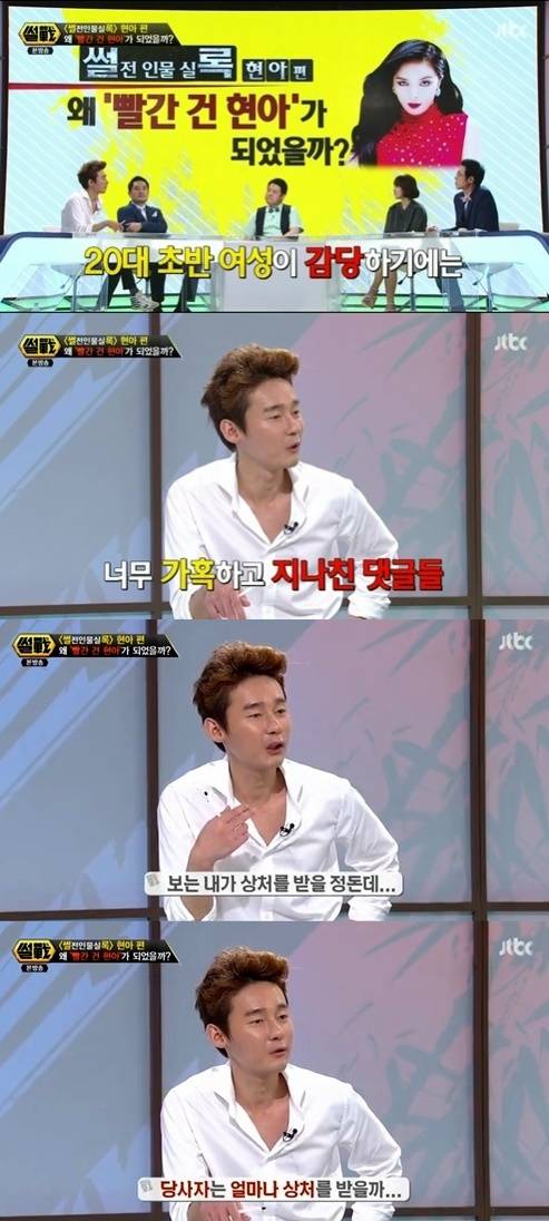 '썰전' 허지웅이 현아의 악플에 대해 걱정을 드러냈다.14일 방송된 JTBC '썰전'에서는 독보적 섹시 콘셉트로 화제와 논란의 중심에 서 있는 현아에 대해 이야기를 나눴다.이날 허지웅은 "가수 개인에 대한 걱정이 든다"며 "솔직히 법에 걸리지만 않으면 섹시한 게 상관없다고 본다"고 말문을 열었다.이어 "현아와 관련된 기사를 찾아보고 달린 댓글을 본 적이 있는데 진짜 경악했다. 저 나이 또래 여자아이가 웬만하면 평생 듣지 않아도 될 이야기를 어마어마하게 듣고 있더라"고 덧붙였다.허지웅은 "보는 내가 상처를 받을 정도인데 당사자는 얼마나 상처 받을까 싶었다"고 말했다. 이에 이윤석은 "섹시 콘셉트 가수가 겪어야 하는 어쩔 수 없는 아픔인 것 같다"고 거들었다.[썰전 허지웅, 사진=JTBC '썰전' 방송 캡처]
