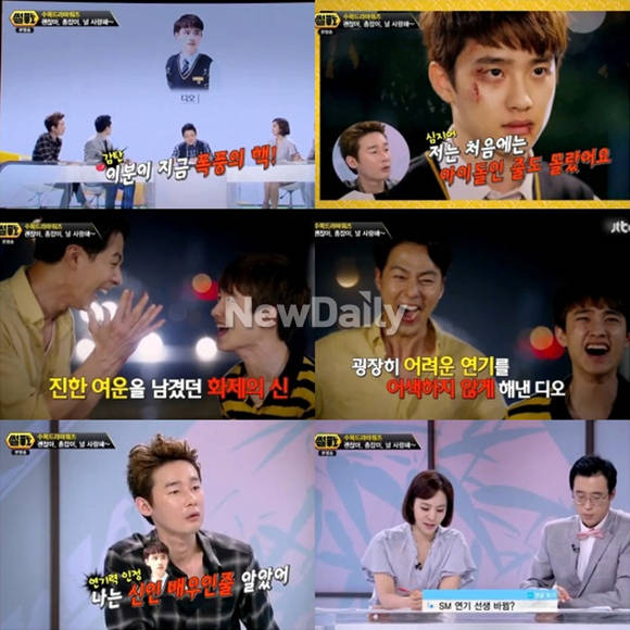 '썰전' 허지웅이 그룹 엑소(EXO) 디오의 연기를 극찬했다.지난 14일 방송된 JTBC '썰전'의 '예능 심판자' 코너에서는 시청률 경쟁을 벌이고 있는 수목드라마 SBS '괜찮아 사랑이야', KBS 2TV '조선총잡이', MBC '운명처럼 널 사랑해'에 대해 집중 분석하는 시간을 가졌다.이날 박지윤은 "드라마 '괜찮아 사랑이야'에서 폭발력 있는 캐릭터가 있는데, 엑소 디오 연기 어떻게 봤냐"고 물었다.이에 허지웅은 "이 분이 지금 폭풍의 핵이다. 처음에는 디오가 아이돌인 줄 몰랐다"며 "조인성과 같이 달리며 웃으면서 우는 장면이 있는데 말로 표현해서 정말 어려운 연기였는데 어색하지 않았다"고 평했다.박지윤 역시 "그 촬영 당시를 생각하면 굉장히 손발이 오그라들 수 있는 상황인데 그걸 잘 하더라"고 칭찬했다. 그러자 허지웅은 "자연스럽게 잘했다. 그래서 나는 신인 배우인 줄 알았다"며 엑소 디오의 연기력을 인정했다.또한, 박지윤은 "나는 제일 웃겼던 댓글이 'SM 연기 선생 바뀜?'이었다"면서 "디오는 완전히 첫 작품에서 연기돌로 인정받을 것 같다"고 밝혔다.[썰전 허지웅 디오 극찬, 사진=JTBC '썰전' 방송 캡처]