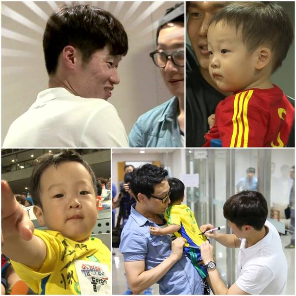 이날 서언이와 서준이는 올스타전 방문을 기념해 유아용 유니폼을 곱게 차려 입고, 앙증맞은 매력을 뽐냈다. 양쪽에 서언, 서준 쌍둥이를 대동한 이휘재는 소문난 축구 광답게 박지성을 만날 생각에 안절부절 못하고 기다리고 있었다. 순간, 이휘재는 인사를 하고 지나가는 박지성을 벼락같이 잡아 세우고는 "애들 한 번만 안아주세요"라며 열혈 축구팬 포스를 선보여 웃음을 자아냈다.