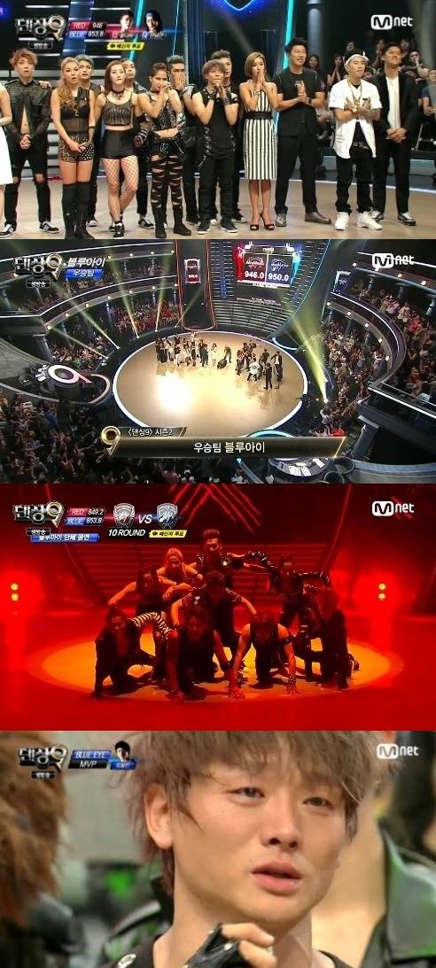 '댄싱9' 시즌2 최종 우승은 블루아이 팀에게 돌아갔다.15일 방송된 Mnet '댄싱 9' 시즌2 마지막회에서는 블루아이와 레드윙즈의 파이널리그 결승전이 펼쳐졌다.앞서 블루아이와 레드윙즈는 각각 1승씩을 주고받은 가운데, 이날 결승전은 두 명의 댄서가 같은 장르의 춤을 추고 각각 따로 평가 받는 '믹스매치'와 '단체무대'를 통해 우승팀을 결정됐다.사전 미션에서 우승한 블루아이는 가산점 3점을 얻어 유리한 고지를 선점했고, 이어진 일대일 대결에서 레드윙즈를 제압하며 4점을 더 획득, 총합 950점으로 우승컵을 품에 안았다.특히, 갓설진 갓수진이라는 별명을 갖고 있는 블루아이 김설진과 레드윙즈 최수진의 에이스 대결은 눈을 뗄 수 없게 만들었다. 두 사람은 헨델의 '울게 하소서' 음악에 맞춰 슬프면서도 아름다운 무대를 꾸몄다. 최고점인 평균 96.8점을 받은 김설진은 0.2포인트의 근소한 차로 최수진을 이겼다.MVP는 김설진이 선정됐다. 파이널리그에서 받은 심사위원 점수 40%와 시청자 인기투표 점수 60%를 합산한 결과 가장 많은 선택을 받아 MVP에 오르는 영광을 안았다.MVP 트로피를 손에 쥔 김설진은 감격의 눈물을 흘리며 "좋은 친구들을 만나 정말 감사드린다"며 "한국에 정말 대단한 댄서들이 많다. 춤에 더 많은 관심을 가져 주시고 계속 응원해달라"고 소감을 밝혔다.['댄싱9' 블루아이 우승, 사진=Mnet '댄싱9' 방송 캡처]