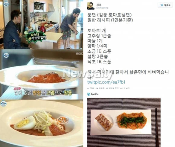 웹툰작가 김풍이 '토마토 냉면'의 레시피를 공개했다.김풍은 16일 자신의 트위터에 "풍면(김풍 토마토냉면) 일반 레시피(1인분 기준)"이라는 글과 함께 한 장의 사진을 올렸다.이어 "토마토 1개, 고추장 1큰술, 마늘 1개, 양파 1/4쪽, 소금 1티스푼, 설탕 3큰술, 식초 1티스푼 해서 믹서기에 갈아서 삶은 면에 비벼 먹습니다"고 설명했다.공개된 사진 속에는 한 접시에 수육과 함께 먹음직스럽게 놓여 있는 토마토 냉면의 모습이 담겨 있다.앞서 15일 방송된 MBC '나 혼자 산다'에서는 전현무가 새 보금자리에서 진정한 살림꾼으로 거듭나기 위해 자취의 달인 김풍의 집을 방문하는 모습이 그려졌다.이날 김풍은 출출한 전현무를 위해 초간단 토마토 냉면을 요리해 대접했고, 이를 맛본 전현무는 "정말 맛있다"며 그 자리에서 무려 세 그릇을 폭풍 흡입했다.[김풍 토마토 냉면 레시피, 사진=MBC '나혼자산다'/ 김풍 트위터 캡처]