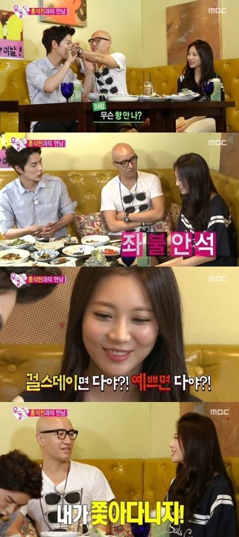 '우리결혼했어요' 홍석천이 걸스데이 유라에 폭풍 질투했다.지난 16일 방송된 MBC '우리결혼했어요 시즌4'(이하 '우결')에서는 홍석천의 음식점을 찾은 홍종현 유라 커플의 모습이 그려졌다.이날 '우리결혼했어요' 홍석천은 홍종현과 유라를 보자 "친구랑 같이 온다며? 유라가 같이 온다는 지인이냐? 어디다 대고 아내냐"며 불편한 심기를 드러냈다.이어 "내가 종현이를 쫓아다닌다. 내게 양보해라"면서 "우리 종현이가 어디가 마음에 든다고 하루 만에 결혼하냐. 걸스데이면 다야? 예쁘면 다야? 내가 종현이를 얼마나 아끼는데.."라고 질투해 웃음을 자아냈다.또한, 홍석천은 유라 앞에서 "무슨 향 안나?"냐며 홍종현에게 가까이 다가가 자신의 향수 향을 맡게 했고, 이를 본 유라는 당혹감을 감추지 못했다.[우리결혼했어요 홍석천, 사진=MBC '우리 결혼했어요' 방송 캡처]
