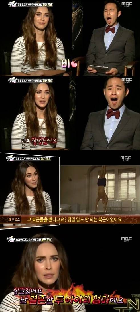 할리우드 배우 메간 폭스가 이상형으로 비(본명 정지훈)를 꼽았다.17일 오후 방송된 MBC '섹션TV 연예통신'에서 제작진은 영화 '닌자 터틀'의 LA 시사회장을 방문해 메간 폭스를 비롯해 주연 배우들을 만나 인터뷰를 가졌다.이날 메간폭스는 이상형을 묻는 질문에 "레인(비)"이라고 깜짝 고백했다. 이어 "매우 잘 생겼다. 영화 '닌자 어쌔신' 속 그 복근들을 봤냐. 진짜 말도 안 되는 복근이다"고 사심을 드러냈다.메간폭스의 말에 리포터는 "비에게는 여자친구가 있다"며 배우 김태희를 간접적으로 언급했다. 그러자 메간폭스는 "나는 결혼한 두 아이의 엄마다. 데이트를 하는 것도 아닌데 어떠냐"고 쿨하게 반응해 웃음을 자아냈다.[메간폭스 이상형 비, 사진=MBC '섹션TV 연예통신' 방송 캡처]
