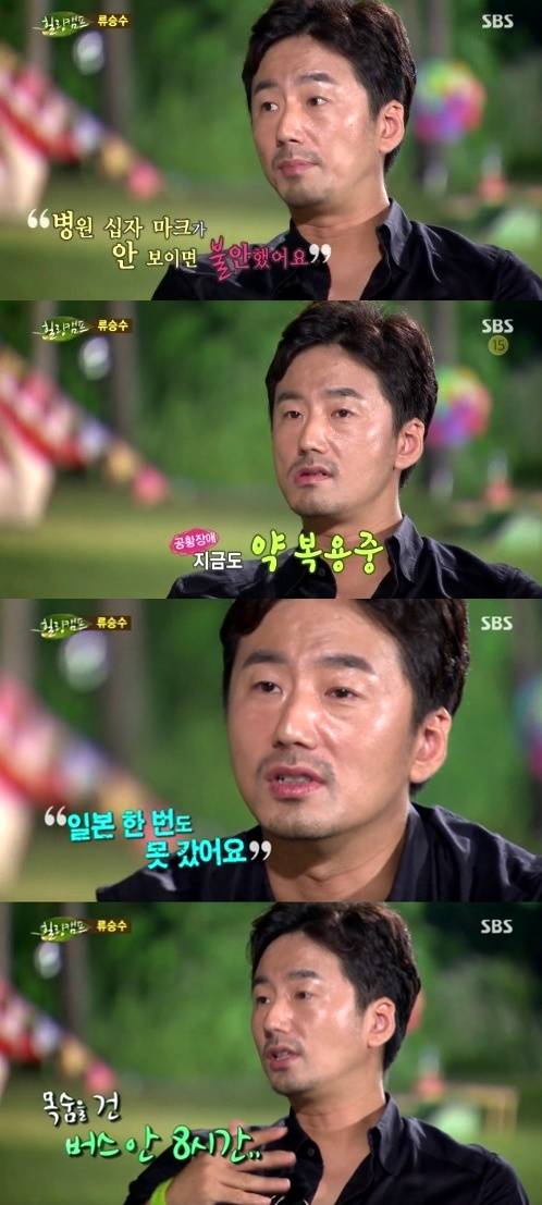 류승수가 공황장애를 고백했다.지난 18일 방송된 SBS '힐링캠프, 기쁘지 아니한가'(이하 '힐링캠프')에서는 배우 류승수가 출연해 솔직한 입담을 펼쳤다.이날 류승수는 학창시절에 대해 이야기를 하던 중 "20세 때 심장 판막에 이상이 생겼다. 증상이 가만히 있다가 갑자기 숨도 못쉬고 마비가 왔다. 그러다 보니까 일주일에 한 번씩 구급차틀 탔다"고 말했다.이어 "공포가 너무 커서 주변에 병원 십자 마크가 없으면 극도로 불안했다. 언제 쓰러질지 모르니까. 그때 그 공포로 인해 공황장애가 왔다. 24년이 지난 지금까지 약을 먹고 있다. 나는 비행기도 못탄다"고 털어놨다.또한, 류승수는 "드라마 '겨울연가' 당시 일본에서 난리가 났다. 모든 배우들이 일본으로 날아가 돈을 벌 때 난 한 번도 가지 못했다"며 "원래는 집 밖도 못 나갔다. 죽는 게 낫다고 생각할 만큼 절망적이었다"고 밝혔다.[류승수 공황장애 고백, 사진=SBS '힐링캠프' 방송 캡처]