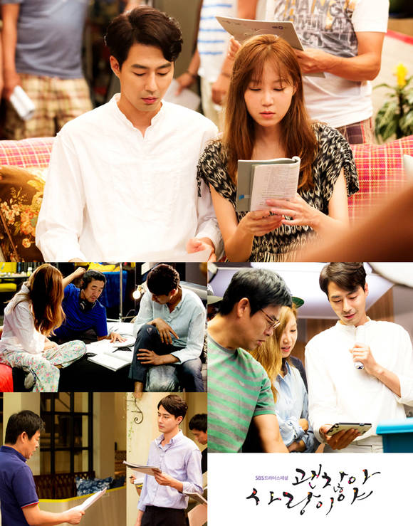 촬영 전 꼼꼼한 사전 리허설을 하며 대사 호흡을 맞춰보고 있는 조인성과 성동일(조동민 역)의 모습 역시 인상적이다. 쉬는 시간에도 선채로 대본에 집중하고 있는 두 배우의 모습이 남다른 열의를 고스란히 담아내고 있다. '괜찮아 사랑이야' 배우들은 수시로 대화를 나누며 드라마의 완성도를 높이기 위한 노력을 아끼지 않고 있다고. 특히, 휴대폰으로 리허설 영상을 찍어 다 함께 모니터링 하는 모습은 '환상 호흡'의 원동력을 짐작케 해 더욱 시선을 끈다.