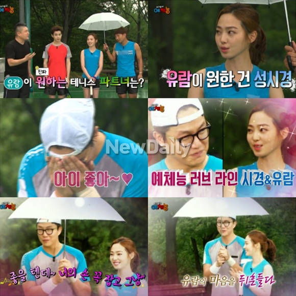 '당구 여신' 차유람이 가수 성시경에게 호감을 드러냈다.지난 19일 방송된 KBS 2TV '우리동네 예체능'(이하 '예체능')에서는 일곱 번째 종목인 테니스 편의 첫 번째 이야기가 전파를 탔다.이날 차유람의 등장에 '예체능' 남자 멤버들은 들썩였고, 강호동은 "진짜 원하는 테니스 파트너는 누구였냐?"고 질문했다.차유람은 "나는 전부터 성시경을 팬으로 좋아했다. 성시경 씨 싫어하는 여자분들 없으시잖아요"라고 답했다. 차유람의 발언에 성시경은 환하게 웃었고, 기존의 테니스 파트너인 이규혁은 씁쓸한 미소를 지었다.이에 강호동은 차유람과 성시경을 이어주기 위해 두 사람을 나란히 세웠다. 성시경은 이규혁이 들고 있던 우산을 뺏아 차유람에게 씌워주며 자신의 히트곡 '좋을 텐데'를 열창해 핑크빛 러브라인을 형성했다.[차유람 성시경 호감, 사진=KBS2 '우리동네 예체능' 방송 캡처]