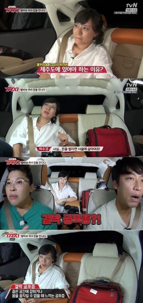 방송인 허수경이 결박공포증을 겪고 있다고 고백했다.지난 19일 방송된 tvN '현장토크쇼 택시'에서는 '당신은 행복하십니까?' 특집 6탄으로 허수경이 출연해 솔직한 입담을 나눴다.이날 MC 이영자와 오만석은 허수경에게 "서울과 제주도를 오가며 생활하고 있는데 경제적으로 부담되지 않느냐?"고 물었다.이에 허수경은 "사실 돈을 벌기 위해서는 서울에서 살아야 한다"며 "하지만 내가 서울의 꽉 막힌 아파트를 거부한다"고 답했다.이어 "창문을 다 열어놓지 않으면 내가 견디기 힘들다. 병원에 가야할 정도로 심한 결박공포증이 있다"고 제주도 생활 이유를 설명했다. '결박공포증'은 좁은 공간에 갇히거나 몸을 움직일 수 없을 때 느끼는 공포증을 말한다.[허수경 결박공포증, 사진=tvN '택시' 영상 캡처]