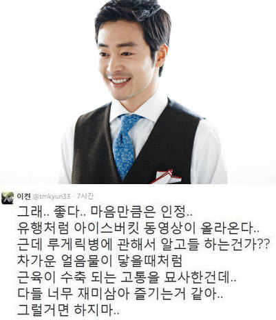 배우 이켠이 아이스 버킷 챌린지 열풍에 일침을 가했다.이켠은 21일 자신의 트위터에 "그래 좋다. 마음만큼은 인정.. 유행처럼 아이스버킷 동영상이 올라온다. 근데 루게릭병에 관해서 알고들 하는 건가? 차가운 얼음물이 닿을 때처럼 근육이 수축 되는 고통을 묘사한건데 다들 너무 재미삼아 즐기는 거 같아. 그럴 거면 하지마"라는 글을 올렸다.이어 "최소한 이것 만큼은 알고 넘어가요. 배우 김명민과 하지원의 주연 영화 '내사랑 내곁에'에서 김명민이 아파했던 병이 루게릭입니다. 얼음물 뒤집어쓴 뒤 기분좋게 시원해하는 모습이 난 별로다"라고 변질된 아이스버킷챌린지에 불편한 심기를 드러냈다.또한, 이켠은 "루게릭병을 앓는 모든 분들 제발 힘내세요.. 아파하는 여러분들을 위해 성금도 기부하도록 하겠습니다’고 외치는 걸 본 적이 없는 건 사실 좀 씁쓸하잖아.. 나도 아이스버킷 찍으려고 했는데 다시 생각하게 되네. 뻔한 홍보물이 될듯해서"라고 전했다.한편, '아이스 버킷 챌린지'는 미국 ALS 협회에서 루게릭병의 치료법을 개발하고 환자들을 돕자는 취지에서 고안한 캠페인으로, 캠페인 동참에 지목된 사람은 24시간 내에 얼음물을 뒤집어쓰거나 100달러를 기부하면 된다. 또한 다음 참가자 3명을 지명해 캠페인을 이어간다.[이켠 아이스버킷챌린지 일침, 사진=폴라리스엔터테인먼트/ 이켠 트위터 캡처]