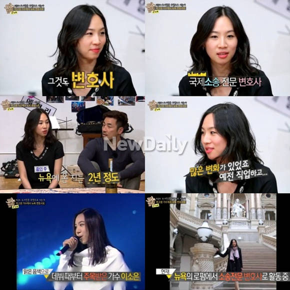 이소은이 근황을 공개했다.가수 출신 변호사 이소은은 20일 방송된 SBS '도시의 법칙 in 뉴욕'(이하 '도시의 법칙') 마지막회에 출연해 근황과 함께 변호사 생활에 대한 진솔한 속내를 털어놨다.이날 이소은은 시카고 노스웨스턴 동문인 존박의 초대로 뉴욕팸을 찾았다. 이소은의 등장에 '도시의 법칙' 멤버들은 깜짝 놀라며 반갑게 맞았고, 이들은 함께 식사를 하며 즐거운 시간을 보냈다.1998년 데뷔한 이래 '서방님', '오래오래' 등의 히트곡을 발표한 이소은은 2009년 미국으로 유학을 떠나 시카고 노스웨스턴 대학 로스쿨을 졸업했다.뉴욕에서 변호사로 제2의 인생을 살고 있는 이소은은 "현재 국제소송 전문 변호사로 활동하고 있다"며 "너무 어릴 때 가수를 시작해서 다른 직업을 갖고 싶다는 생각을 했다. 삶을 길게 봤을 때 다른 직업을 하면 어떨까 싶어서 시작했다"고 밝혔다.['도시의 법칙' 이소은 근황, 사진=SBS '도시의 법칙' 방송 캡처]