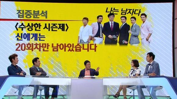 '썰전' 이윤석이 유재석에게 남성성을 드러내야한다고 조언했다.21일 방송될 JTBC '썰전'에서는 20회 시즌제를 선언한 KBS2 '나는 남자다'를 비롯한 한국판 시즌제 프로그램들에 대해 집중 분석한다.김구라, 강용석, 박지윤, 이윤석, 허지웅 등 예능심판자들은 얼마 전 정규방송을 시작한 '나는 남자다'의 성적과 관련해 "3% 아래로 떨어지지 않는 이상 탄력을 받아 잘 될 가능성이 있다"고 전망했다.특히, 이윤석은 "유재석씨가 '나는 남자다'에서 '나는 유재석이다'를 증명하고 있다"고 분석하면서 "앞으로는 유재석씨가 좀 더 거친 모습으로 '유재석도 남자다'라는 것을 보여줬으면 좋겠다"고 말해 공감을 이끌어냈다.JTBC '썰전'은 21일 방송된다.['썰전' 이윤석 '나는 남자다' 유재석 언급, 사진=JTBC]