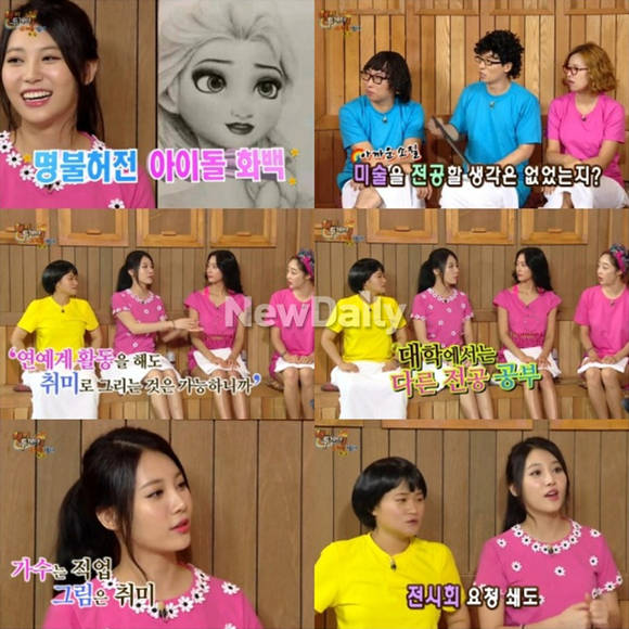 걸스데이 유라가 뛰어난 그림실력에도 불구하고 미대를 가지 않은 이유를 털어놨다.지난 21일 방송된 KBS 2TV '해피투게더 시즌3'에서는 '뜨거운 남녀' 특집으로 요즘 연예계에서 가장 핫한 6인방 최여진, 클라라, 걸스데이 유라, 샘 오취리와 에네스 카야, 오타니 료헤이가 출연해 숨겨둔 입담을 뽐냈다.이날 유라는 MC 유재석에게 직접 그린 초상화를 액자에 넣어 선물했다. 유라가 그린 '유재석 초상화'는 그야말로 싱크로율 백퍼센트를 자랑하며 당사자인 유재석을 비롯해 출연자들의 감탄을 자아냈다.이에 MC들은 "미술을 전공할 생각은 없었는지?"라고 물었다. 유라는 "원래 미술은 옛날부터 다들 잘 한다고 하니까 했었다. 가수 하면서 취미로 그릴 수 있으니까 대학은 다른 데로 갔다"고 답했다.이어 "가수는 직업이고, 그림은 지금처럼 일을 하면서 그릴 수 있다. 후회는 안됐다"고 덧붙였다.['해피투게더' 유라, 사진=KBS2 '해피투게더' 방송 캡처]