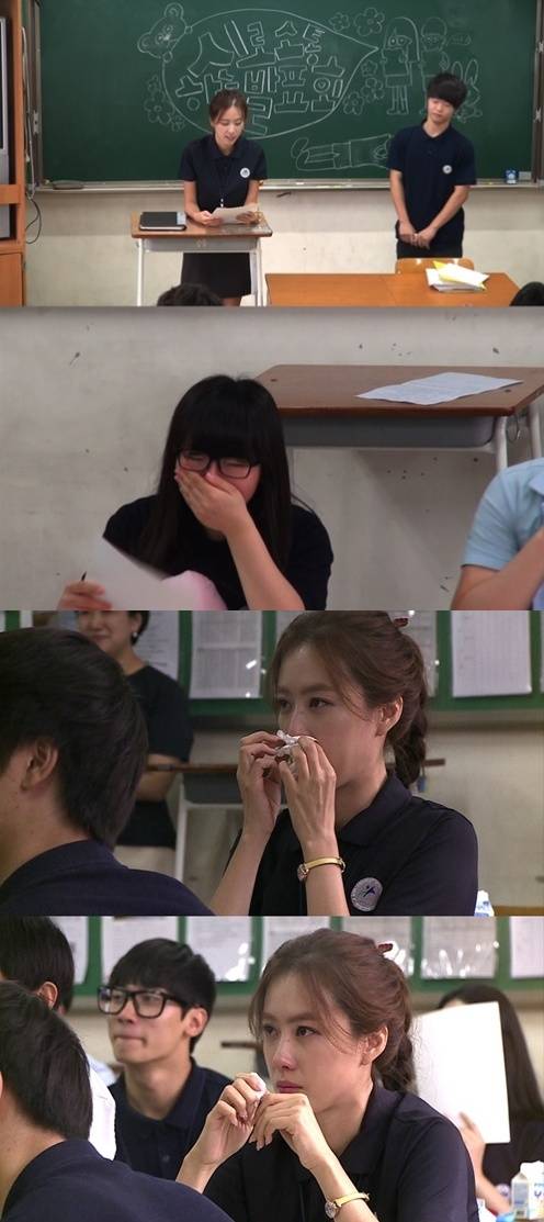 '학교 다녀오겠습니다' 홍은희가 자작시로 학급 전체를 울렸다.최근 진행된 JTBC '학교 다녀오겠습니다' 녹화에서 가족에 대한 사랑을 소재로 지은 홍은희의 시에 교실이 눈물바다가 됐다.홍은희는 지난 16일 방송에서 안도현의 시 '스며드는 것'을 읽고 눈물을 흘렸다. 두 아이의 엄마로서 가족에 대한 애틋한 사랑의 마음이 담긴 시의 내용에 몰입됐던 것. 이어 홍은희는 국어시간 자작시 짓기 수업중 가족애가 드러난 시를 지어 발표했다.홍은희의 자작시 낭독을 듣고 있던 고교생들이 하나둘씩 눈물을 흘리기 시작했고, 홍은희 역시 새어나오는 눈물을 참으며 간신히 시를 읽어 내려갔다.마침내 홍은희의 발표를 듣던 선생님마저 눈물을 보여 교실 전체가 눈물바다로 변했다. 심지어 홍은희의 발표가 진행되는 동안 감정을 주체하지 못해 대성통곡하는 학생까지 나왔다.홍은희의 자작시와 이에 감명 받은 고등학생들의 모습은 8월 23일 오후 9시 40분 방송되는 JTBC '학교 다녀오겠습니다'에서 확인할 수 있다.[홍은희 자작시, 사진=JTBC '학교 다녀오겠습니다']