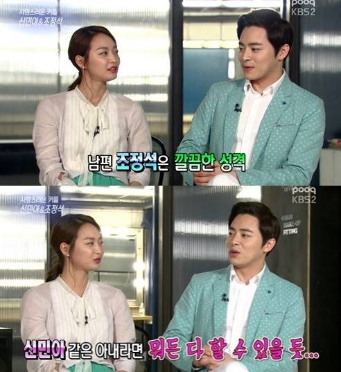 배우 신민아 조정석이 서로에 대한 호감을 드러냈다.지난 23일 방송된 KBS 2TV '연예가중계'에서는 영화 '나의 사랑 나의 신부'에서 함께 호흡을 맞춘 신민아 조정석과 인터뷰를 진행했다.영화 '나의 사랑 나의 신부'는 지난 1990년 박중훈 故 최진실이 주연을 맡고, 이명세 감독이 연출한 동명의 영화를 리메이크한 작품으로 현 시대 신혼부부에 대한 이야기를 솔직하고 재기 발랄하게 그려낼 예정이다. 신민아 조정석이날 신민아는 결혼 상대로 조정석이 어떠냐는 질문에 "깔끔한 성격이다. 청소, 빨래, 설거지를 도와주지 않을까 싶다"라고 밝혔다.또한, 조정석은 신민아에 대해 "매일 즐겁고 행복할 것 같다. 그럼 뺄래나 청소도 하고, 못하는 요리도 배우고 그럴거다"고 은근한 마음을 표현했다.[신민아 조정석, 사진=KBS2 '연예가중계' 방송 캡처]
