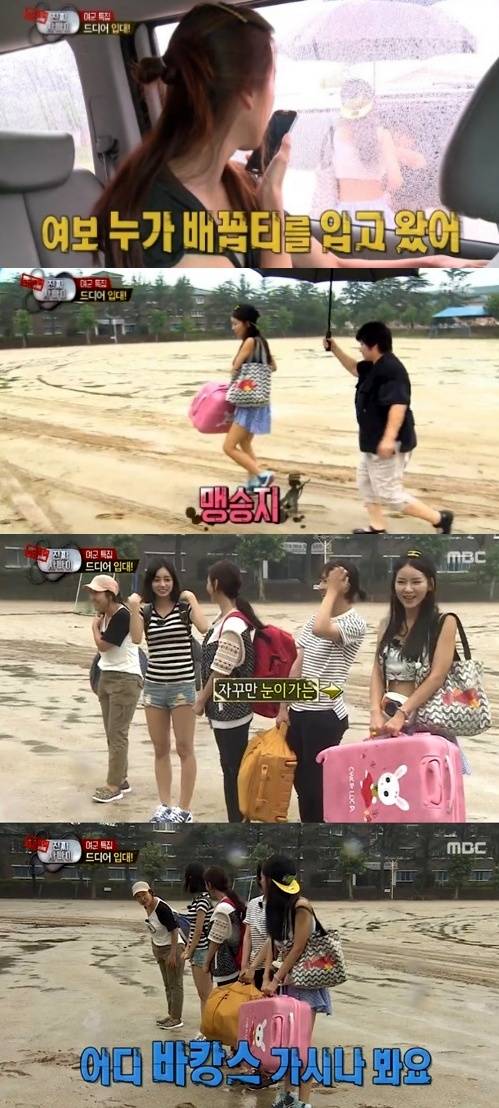 '진짜사나이' 여군특집에 개그우먼 맹승지가 배꼽티를 입고 입소했다.24일 방송된 MBC '일밤-진짜사나이' 여군특집에서는 홍은희, 김소연, 라미란, 지나, 걸스데이 혜리, 맹승지, 박승희가 출연해 훈련소에 입소, 적응하는 모습이 그려졌다.이날 맹승지는 야구모자에 배꼽티를 입은 채 핑크색 캐리어를 들고 등장해 눈길을 끌었다.이에 입소 전 차안에서 남편 유준상과 통화를 하던 홍은희는 "누가 배꼽티를 입고 왔어"라고 말하며 놀라움을 드러냈다.맹승지의 입소 패션을 본 라미란은 "지금 바캉스 가세요?"라고 지적해 웃음을 자아냈다.['진짜사나이' 맹승지 입소패션, 사진=MBC '진짜사나이' 여군특집 방송 캡처]