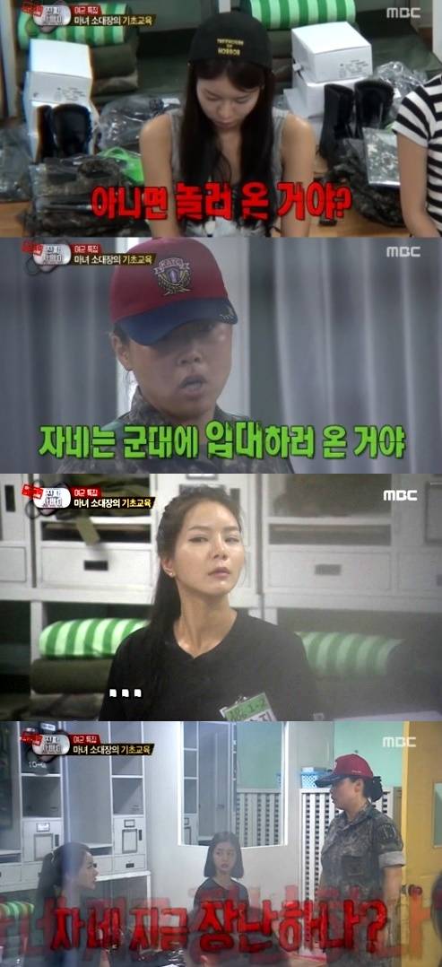 개그우먼 맹승지의 태도에 여자 소대장이 분노를 폭발했다.24일 방송된 MBC '일밤-진짜 사나이' 여군특집에서는 홍은희, 김소연, 라미란, 지나, 걸스데이 혜리, 맹승지, 박승희가 육군훈련소에 입소해 생활하는 모습이 그려졌다.이날 전지숙 소대장은 배꼽티를 입고 온 맹지를 보며 "옷차림이 그게 뭐냐. 정신력이 해이한 것 같다"고 밝혔다. 맹승지는 소대장과의 면담에서도 '다나까'를 제대로 사용하지 못해 요주의 인물로 찍혔다.이후 전 소대장은 생활관에서 맹승지의 가방을 확인하던 중 초코과자가 나오자 지적했다. 이에 맹승지는 "당 떨어질까봐.."라고 답했고, 전 소대장은 "안내문에 그렇게 쓰여있었냐"며 소리쳤다.이어 "맹승지 후보생 안 되겠네. 자네는 지금 군대에 입대하러 온거야. 아니면 놀러 온거야?"라면서 "옷차림부터 진짜 마음에 안 든다"고 언성을 높였다.맹승지는 이후에도 관등성명을 제대로 하지 못해 소대장으로부터 "자세가 부족하다"고 혼이 났고, 결국 홀로 얼차려까지 받으며 애증의 훈련생으로 등극했다.[진짜사나이 여군 맹승지, 사진=MBC '진짜사나이' 여군특집 방송 캡처]