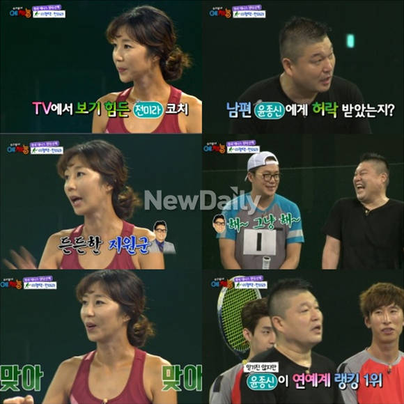 '테니스의 여제' 전미라가 남편 윤종신이 '우리동네 출연'을 지지해줬다고 털어놨다.26일 방송된 KBS 2TV '우리동네 예체능'에서는 우리나라 최고의 테니스 스타 이형택과 전미라가 전담 코치로 등장하는데 이어 쿨 이재훈이 새로운 멤버로 합류하는 모습이 그려졌다.이날 전미라의 등장에 MC 강호동은 "예능 방송인데 윤종신한테 허락을 받았냐"고 물었다. 이에 전미라는 "신랑이 내가 하는 일은 다 지지해준다. 일단 하라고 해준다"고 답했다.그러자 성시경은 "해~ 그냥 해~ 괜찮아"라고 윤종신의 성대모사로 웃음을 자아냈고, 이를 들은 전미라는 "맞다. 그렇게 했다"고 밝혔다.또한, 신현준이 "윤종신 테니스 잘 치지 않냐"고 언급했고, 성시경은 "말은 페더러다"고 말해 또 한 번 폭소케 했다. 하지만 강호동은 "경력이나 구력 테크닉적으로 봤을 때 연예계 랭킹 1위는 윤종신이다"고 테니스 실력을 인정했다.['우리동네 예체능' 전미라, 사진=KBS2 '우리동네 예체능' 방송 캡처]