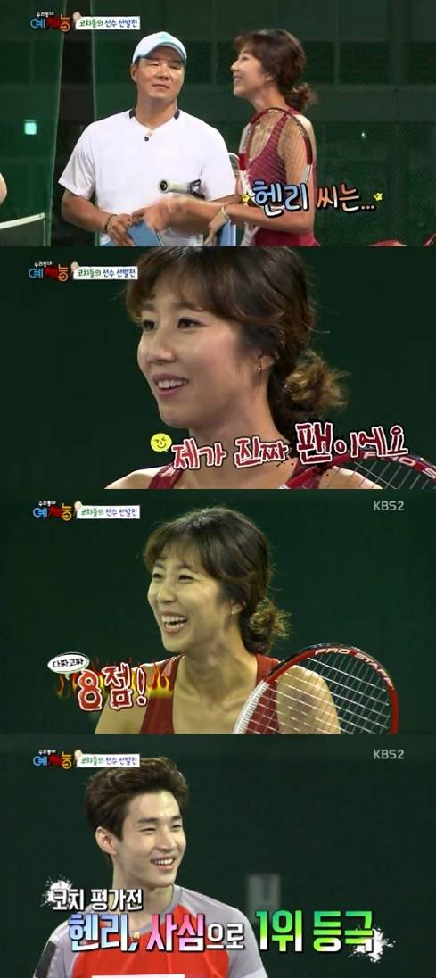 윤종신의 아내 전미라가 헨리에 대한 사심을 고백했다.지난 26일 방송된 KBS 2TV '우리동네 예체능'에서는 지난주 첫 포문을 열었던 '예체능' 테니스팀이 서열을 정하며 정식 훈련을 시작하는 이야기가 전파를 탔다.이날 한국 최초 ATP투어에서 우승했던 이형택과 대한민국 사상 최초 윔블던 주니어 세계 2위를 기록했던 전미라가 '예체능' 테니스 코치로 합류해 눈길을 끌었다.제자 선발 테스트를 하던 전미라는 헨리의 결과 발표를 앞두고 갑자기 웃음을 터트렸다. 전미라는 헨리를 향해 사심 가득한 눈빛으로 "내가 진짜 팬이다"라며 "힘들게 일하고 와서 집에서 헨리 나오는 걸 보고 힘을 얻는다"고 밝혔다.이어 전미라는 "정말 즐거운 신 것 같다"고 말하며 헨리에 10점 만점에 8점을 줬고, 헨리는 '우리동네 예체능' 멤버들 중 최고점으로 1위를 차지했다.[전미라 헨리 사심 고백, 사진=KBS2 '우리동네 예체능' 방송 캡처]