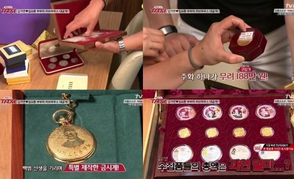 김가연이 비밀금고를 공개했다.김가연 임요환 부부는 26일 밤 방송된 tvN '현장토크쇼 택시'에서 출연해 온갖 루머부터 신혼집 공개까지 시청자들의 궁금증을 풀어냈다.이날 김가연 임요환 부부의 집을 방문한 MC 이영자와 오만석은 비밀금고를 보여달라고 부탁했고, 집안 어딘가로 간 두 사람은 비밀금고 안에 들어있는 것들을 꺼내왔다.금고 안에는 서울 올림픽 기념주화와 백범 김구 선생님이 새겨진 50개 한정판 금시계가 있었다. 김가연은 "아버지 취미생활이었다. 그 중 저렴한 것들을 내게 물려주신 것 같다"고 말했다.특히, 금고 안에 있던 주화는 하나에 188만원 정도의 금액으로 놀라움을 자아냈으며, 대략 가격을 측정한 오만석은 3,000만 원 이상이라고 밝혀 이목을 끌었다.[김가연 비밀금고 공개, 사진=tvN '현장토크쇼 택시' 캡처)