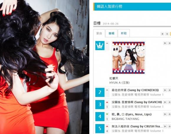 현아의 '빨개요'가 대만 차트에서 1위를 차지하며 무서운 뒷심을 발휘하고 있다.대만의 최대 음악사이트인 케이케이박스(KK BOX)에 따르면 현아의 '빨개요'가 24일부터 K팝 신곡 일간차트 정상을 차지, 27일에 발표된 일간차트까지 3일 연속 1위 자리를 이어가고 있다.지난 21일 케이케이박스 차트에 첫 진입한 현아의 '빨개요'는 대만 현지에서 발매 된 지 4일여 만에 K팝 신곡차트, 싱글차트에서 각각 정상을 기록하며 이름을 올렸다. 이 외에도 현아 미니 3집 음반 '에이토크(A Talk)'의 수록곡 '에이토크(A Talk)'와 '프렌치키스(French Kiss)'가 각각 8위와 10위에 랭크, 음반 중 3곡을 줄줄이 차트 톱10 내에 진입시키는 대단한 파워를 보였다.현아는 지난 17일을 기점으로 국내에서 진행된 '빨개요'의 모든 프로모션을 성공리에 마무리한 상황이지만 중국어권 내에서는 여전히 끝나지 않는 '현아 파워'를 증명하고 있다. 앞서 중국 내 최대 뮤직비디오 사이트인 '인웨타이'에서도 4일 연속 1위를 차지한 바 있는 현아의 '빨개요'는 대만 차트 역시 장악하며 당분간 중국어권을 중심으로 폭 넓은 관심을 받으며 인기 가도를 이어갈 전망이다.한편, 현아는 지난 7월 28일 독보적 섹시카리스마를 무기로 한 미니 3집 음반 타이틀곡 '빨개요'를 발표하고 솔로 데뷔 후 첫 음악방송 1위에 등극하는 등 국내의 뜨거운 인기를 얻었다. 현재 성공리에 '빨개요' 활동을 마무리하고 화보, 광고 등 개별 활동에 몰두하고 있다.[현아 대만차트 1위, 사진=큐브엔터테인먼트]
