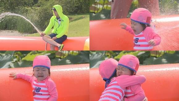 장난꾸러기 아빠 정웅인의 물벼락에 막내딸 다윤이가 울음을 터뜨렸다.31일 방송될 MBC '일밤-아빠! 어디가?' 막내특집에는 그동안 형, 누나, 언니의 여행에 부러운 눈길만 보냈던 막내들의 신나는 일일 여행이 공개된다.이날 수영장에 간 정웅인과 딸 소윤, 다윤 자매가 물놀이를 즐기는 가운데, 아빠 웅인이 막내딸에게 호스로 물을 뿌리는 짖궂은 장난을 쳤고, 세 살배기 다윤이는 울음을 터뜨리고야 말았다.이에 6살 소윤이가 동생에게 다가가 안아주며 울지 말라고 달래주며 어른스러운 모습을 보여 현장에 있던 아빠와 스태프들을 모두 감동했다.류진 아들 찬호, 김성주 딸 민주, 그리고 정웅인 부녀가 함께한 물놀이는 더운 여름을 맞아 서로 물을 뿌리는 장난에서 시작해 어른들까지 참여한 다소 터프한 전쟁(?)으로까지 번졌다는 후문이다.MBC '아빠어디가'는 8월 31일 오후 4시 50분 방송된다.['아빠어디가' 정다윤 눈물, 사진=MBC]