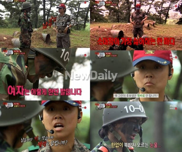 결국 소대장은 맹승지에게 얼차려를 팔굽혀펴기 20회를 명령했다. 하지만 맹승지는 팔굽혀펴기를 제대로 수행하지 못해 소대장의 지적을 또 받았다. 이에 맹승지는 "못하겠습니다. 무릎 꿇고 하겠습니다. 여자는 이렇게 한단 말입니다"라고 말했다.