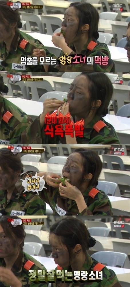 걸그룹 걸스데이 혜리가 쌈밥 먹방으로 남다른 식욕을 자랑했다.31일 방송된 MBC '일밤-진짜사나이' 여군특집에서는 홍은희, 김소연, 라미란, 지나, 혜리, 맹승지, 박승희가 육군훈련소에서 훈련을 받는 두 번째 이야기가 그려졌다.이날 여군 멤버들은 고된 각개전투 훈련을 마치고 저녁식사 메뉴로 제육쌈밥을 먹었다. 하지만 위장크림이 얼굴에 가득했고, 라미란은 "왜 얼굴 이럴 때 쌈밥이 나오는 거냐"고 말했다.특히, 혜리는 걸그룹 이미지도 버리고 엄청난 크기로 쌈을 싸서 입을 벌리며 폭풍 먹방을 선보였다. 혜리는 "지금까지 먹어본 제육볶음 중에 가장 맛있다"며 행복한 미소를 지었다.이어 소대장은 "더 먹고 싶은 사람은 자율배식을 하라"고 말했고, 혜리는 처음 받은 배식보다 더 많은 양을 식판에 담아 쌈밥을 먹었다.입이 찢어질 것 같은 쌈밥을 먹는 혜리의 모습에 홍은희는 "보는 것만 봐도 배가 부릅니다"라고 흐뭇한 엄마의 마음을 드러냈다.['진짜사나이' 혜리 쌈밥 먹방, 사진=MBC '진짜사나이' 여군특집 방송 캡처]