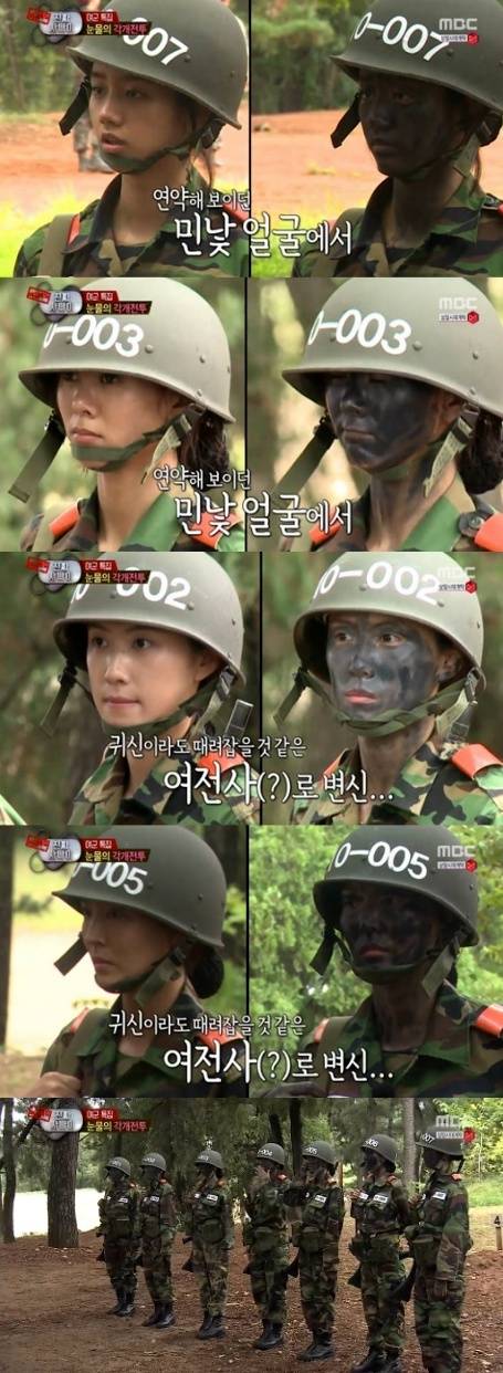 '진짜사나이' 여군특집 멤버들이 시꺼먼스로 변신했다.8월 31일 방송된 MBC '일밤-진짜사나이' 여군특집에서는 홍은희, 김소연, 라미란, 지나, 혜리, 맹승지, 박승희가 육군훈련소에서 훈련을 받는 두 번째 이야기가 그려졌다.이날 멤버들은 각개전투를 앞두고 위장크림을 얼굴에 발랐다. 소대장은 위장 방법을 설명한 후 3분 만에 위장할 것을 지시했다.처음 화장을 하는 것처럼 위장크림을 바르던 멤버들은 소대장의 호통에 얼굴, 팔, 목, 귀 등에 거침없이 바르기 시작했다.잠시 후 홍은희, 김소연, 라미란, 지나, 혜리, 맹승지, 박승희 등 일곱 멤버는 연약한 여배우와 걸그룹 미모는 어디가고 귀신이라도 때려잡을 것 같은 여전사로 180도 변신, 눈길을 사로잡았다.['진짜사나이' 여군특집, 사진=MBC '진짜사나이' 여군특집 방송 캡처]