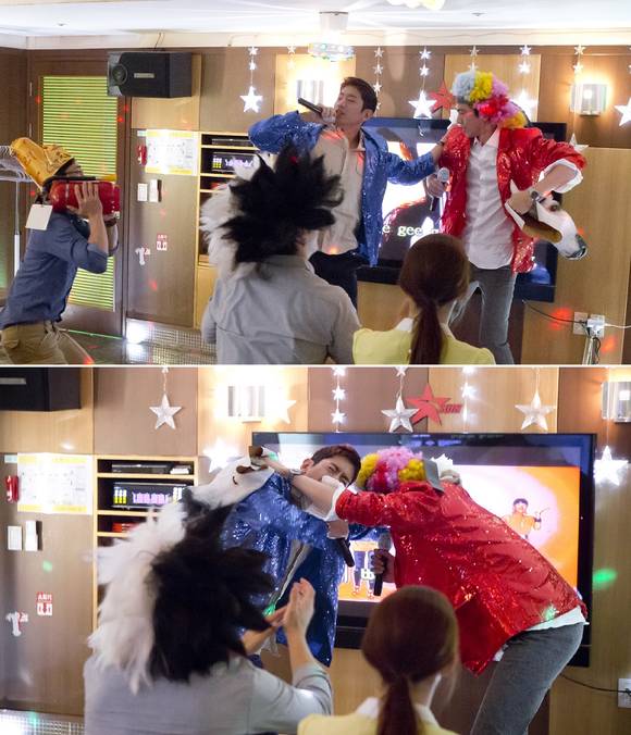 '연애의 발견' 문정혁과 성준이 만취 막춤으로 완전히 망가진다.지난 1일 방영된 KBS 2TV 월화드라마 '연애의 발견'(극본 정현정, 연출 김성윤 이응복) 5회분에서 술에 취한 강태하(문정혁)가 한여름(정유미)에게 진심을 고백했다. 그러나 여름은 오히려 남자친구 남하진(성준)을 술자리에 데려와 더욱 다정한 모습을 보이며 잔인하게 태하의 마음을 괴롭혔다.술자리는 결국 노래방까지 이어졌다. 2일 방송될 '연애의 발견' 6회 방송에 앞서 공개된 스틸컷은 고정 만취 레퍼토리인 막춤 퍼레이드를 보여주고 있다. 그런데 댄스 듀오를 결성한 듯 반짝이 의상을 맞춰 입은 두 남자, 마치 서로 연적이란 사실을 잊은 채 부쩍 친해진 모습이다. 어깨동무를 걸치는 것도 모자라 부둥켜안고 춤을 추고 있다. 소화기를 ENG카메라처럼 어깨에 얹어놓은 윤실장(이승준). 만취 노래방엔 이런 사람 꼭 있다.술을 마시면 의리로 뭉치는 남자들의 세계를 보여줄 노래방 씬. 리얼한 연애공감대를 형성하고 있는 '연애의 발견'이 코믹한 재미까지 장착해 심혈을 기울여 준비했다. 현장 분위기만으로도 이미 웃음은 보장. 문정혁과 성준은 진짜 술에 취한 것처럼 누가 더랄 것도 없이 온몸을 내던진 막춤과 목청을 올인한 노래로 현장을 올킬시켰다는 후문. 촬영을 마치고 무대에 주저앉을 정도로 에너지를 쏟은 두 배우 덕분에 현장엔 웃음이 끊이지 않았다고.제작사 제이에스픽쳐스 관계자는 "다음날 아침 숙취와 함께 깨어나 필름 되감기를 하는 것처럼 되살아나는 기억들 때문에 괴로웠던, 누구나 한번쯤 겪어봤을 경험을 그렸다. 공개한 사진은 맛보기다. 문정혁과 성준이 사력을 다해 웃겼다"고 전해 기대감을 높였다.문정혁과 성준이 마음껏 웃긴 노래방 신은 2일 밤 10시 방송되는 KBS2 월화드라마 '연애의 발견' 6회에서 확인할 수 있다.['연애의 발견' 문정혁 성준 막춤, 사진= 제이에스픽쳐스]