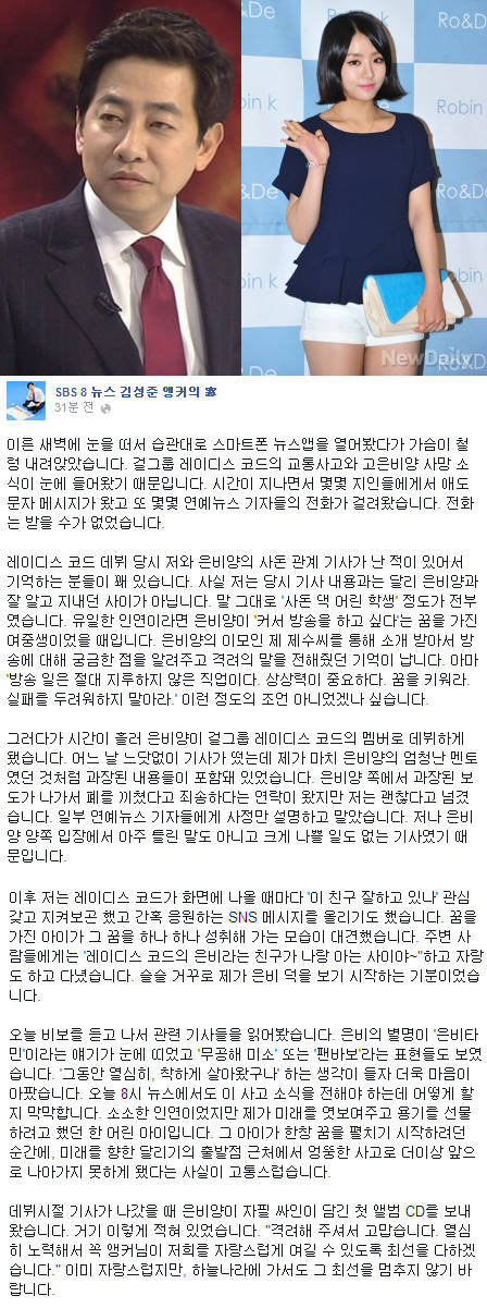 김성준 앵커는 "그러다가 시간이 흘러 은비양이 걸그룹 레이디스 코드의 멤버로 데뷔하게 됐습니다. 어느 날 느닷없이 기사가 떴는데 제가 마치 은비양의 엄청난 멘토였던 것처럼 과장된 내용들이 포함돼 있었습니다. 은비 양 쪽에서 과장된 보도가 나가서 폐를 끼쳤다고 죄송하다는 연락이 왔지만 저는 괜찮다고 넘겼습니다"고 회상했다.