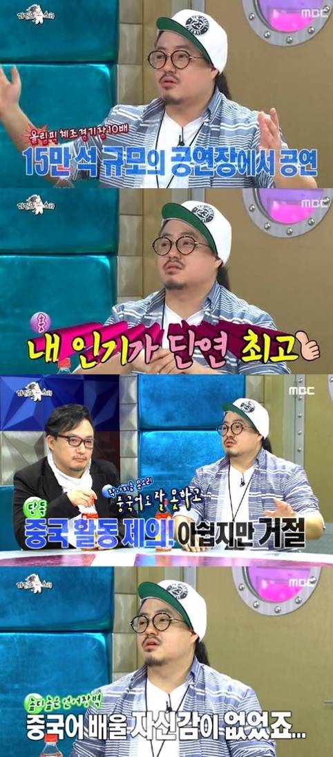 노유민이 NRG 시절 중국에서의 높은 인기를 자랑했다.지난 3일 방송된 MBC '황금어장-라디오스타'(이하 '라디오스타')에는 '노래하는 목들-No목들' 특집으로 신해철, 노유민, 윤민수가 출연해 솔직한 입담을 뽐냈다.이날 노유민은 "한국에서 NRG 1집이 잘 안 됐다. 이슈는 있었지만 큰 성과는 없었다. 어떨결에 중국 CCTV에서 방송을 하게 됐는데 대박이 났다"고 운을 뗐다.이어 "섭외가 들어오기 시작하면서 공항에 가면 레드카펫을 깔아주고 15만석 공연장에서 공연하고 그랬다"며 "멤버 중에는 내 인기가 가장 많았다. 단독 광고까지 찍었고, 중국에서 아예 활동할 생각이 없냐는 제의도 들어왔다"고 밝혔다.노유민은 "하지만 거절했다. 중국어를 배울 자신감이 없었다. 내가 중국어를 잘했다면 갔을 수도 있는데 배움이 느려서 제2외국어를 배운다는 것은 있을 수 없는 일이다"고 말해 웃음을 자아냈다.[라디오스타 노유민, 사진=MBC '라디오스타' 방송 캡처]