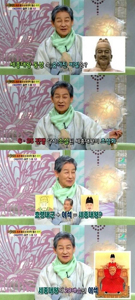 조선왕조 마지막 황손 이석이 광화문 세종대왕 동상에 얽힌 비화를 밝혔다.이석은 4일 오전 방송된 KBS 2TV '여유만만'에 출연해 "광화문에 있는 세종대왕 동상이 내 얼굴이다"고 깜짝 고백했다.이어 "세종대왕 어진이 6.25 때 소실됐다. 조각가가 관악산 효령대군과 내가 '아침마당'에 나온 모습을 합쳐서 세종대왕 동상을 만들었다고 하더라"고 밝혀 놀라움을 자아냈다.또한, 이석은 "내가 세종대왕의 28대손이다. 나의 고고조 할아버지는 정조대왕"이라며 "흥선대원군은 증조부이다"고 전했다.[마지막 황손 이석, 사진=KBS2 '여유만만' 방송 캡처]