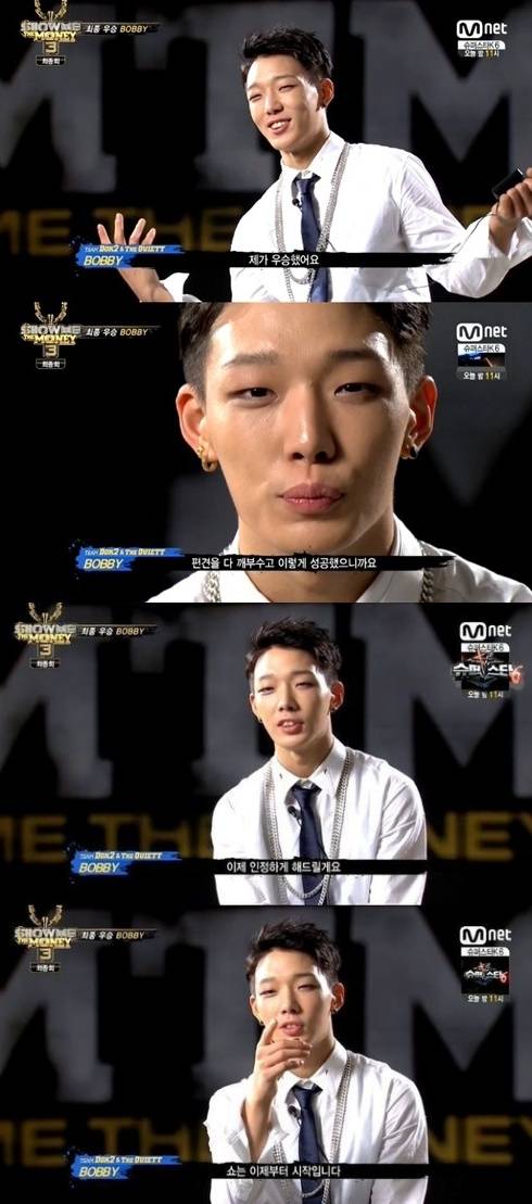 바비가 '쇼미더머니3' 우승 소감을 전했다.지난 4일 방송된 Mnet '쇼미더머니3'에서는 씨잼을 누르고 파이널 무대에 오른 양동근 팀 아이언과 도끼-더콰이엇 팀 바비의 최종 결승전이 펼쳐졌다.이날 바비는 '가드올리고 바운스'라는 곡으로 실력이 없는 아이돌을 꼬집는 돌직구 랩을 선보이며 경쟁자 아이언을 제치고 최종 우승을 거머쥐었다.바비는 미국에 계신 부모님을 향해 "엄마 나 1등했다. 집 조금 있으면 살테니까 미리 짐 싸놓으세요"라고 우승소감을 밝혔다. 이어 "여기까지 함께 해주셨던 적이었지만 동료 같은 분들 정말 감사했고 사랑한다"고 덧붙였다.이후 인터뷰에서 바비는 "'쇼미더머니3' 시청자 분들 내가 우승했다. 편견을 다 깨부수고 이렇게 성공했으니 인정해달라. 쇼는 이제부터 시작이다"고 각오를 다졌다.['쇼미더머니3' 바비 우승소감, 사진=Mnet '쇼미더머니3' 방송 캡처]